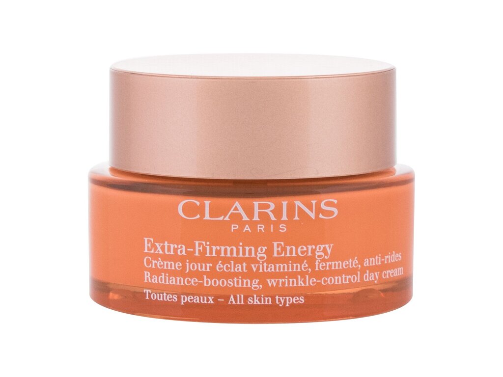 Clarins Extra-Firming Energy Day Cream je krema za obraz, ki kožo hkrati navlaži, poživi, napolni in izboljša njeno čvrstost. Tekstura je udobna in kožo takoj napolni s sijočim sijajem, primerna za vse tipe kože, izdatno hranljiva in tudi prijetno dišeča.