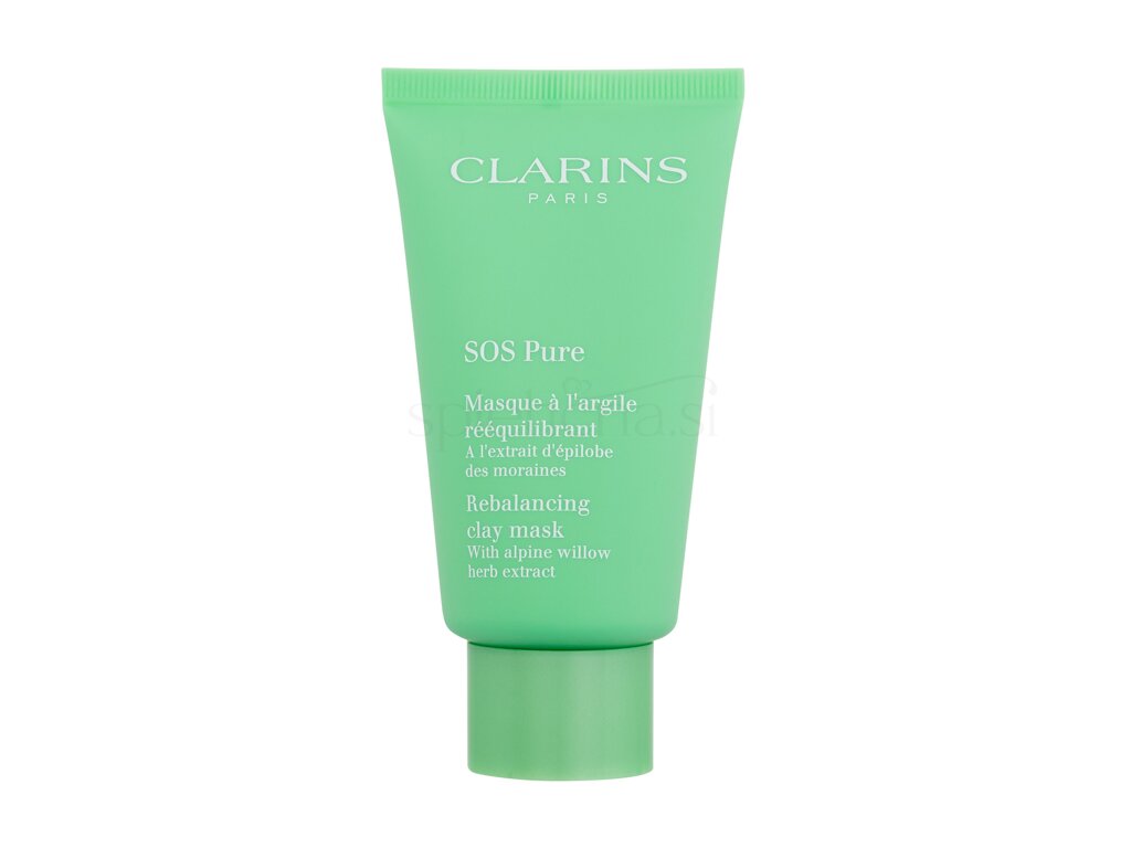 Clarins SOS Pure Rebalancing je 10-minutni ponovni zagon kože, ki je ponavadi mastna. Čistilna maska za obraz iz gline vsebuje izvleček organske alpske vrbe, ki pomaga matirati, zmanjša sijaj in zmanjša videz por. Bela in zelena glina pomagata absorbirati nečistoče, gladita kožo in spodbujata zdrav videz. Praškasta kremasta pasta pušča kožo čisto, osveženo in žarečo ter predvsem nikoli suho.