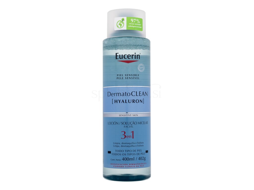 Eucerin DermatoClean Hyaluron Micellar Water 3in1 je micelarni čistilni fluid 3 v 1, ki blago, a učinkovito odstrani nečistoče in vodoodporna ličila. Obogaten je z vlažilnimi sestavinami, ki kožo očistijo, ne da bi jo pri tem izsušile. Primeren je za vsakodnevno uporabo in za občutljivo kožo.