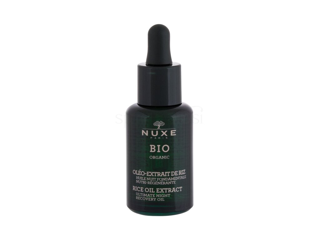 Nočno olje za regeneracijo normalne do suhe kože NUXE Bio Organic Rice Oil Extract Night Recovery Oil ponoči temeljito neguje, obnavlja in popravlja.