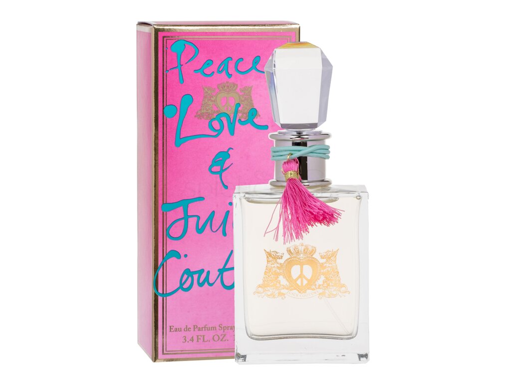 Nova dišava Juicy Couture Peace, Love and Juicy Couture je vonj, ki ga je navdihnil hipijevski stil in nas vrača nazaj v svobodomiselna 60. leta. Masivna steklenička dišave je izdelana iz debelega stekla in okrašena s čudovitimi okraski, kot so turkizne perle in rožnate resice. Dišava je bila na trgu predstavljena leta 2010.