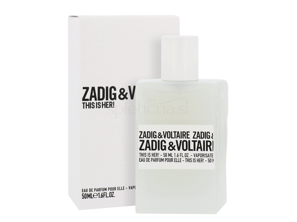 Zadig & Voltaire This is Her! je dišava, ki pooseblja samozavestno, nepredvidljivo in neustavljivo žensko. Čuten, svoboden in lahkoten, ta presenetljiv in pikanten cvetlični šopek je sestavljen iz jasmina sambaka in rožnatega jagodičevja, s sladko noto kostanja v kombinaciji z vanilijo, in ne smemo pozabiti na podpis močne sandalovine.