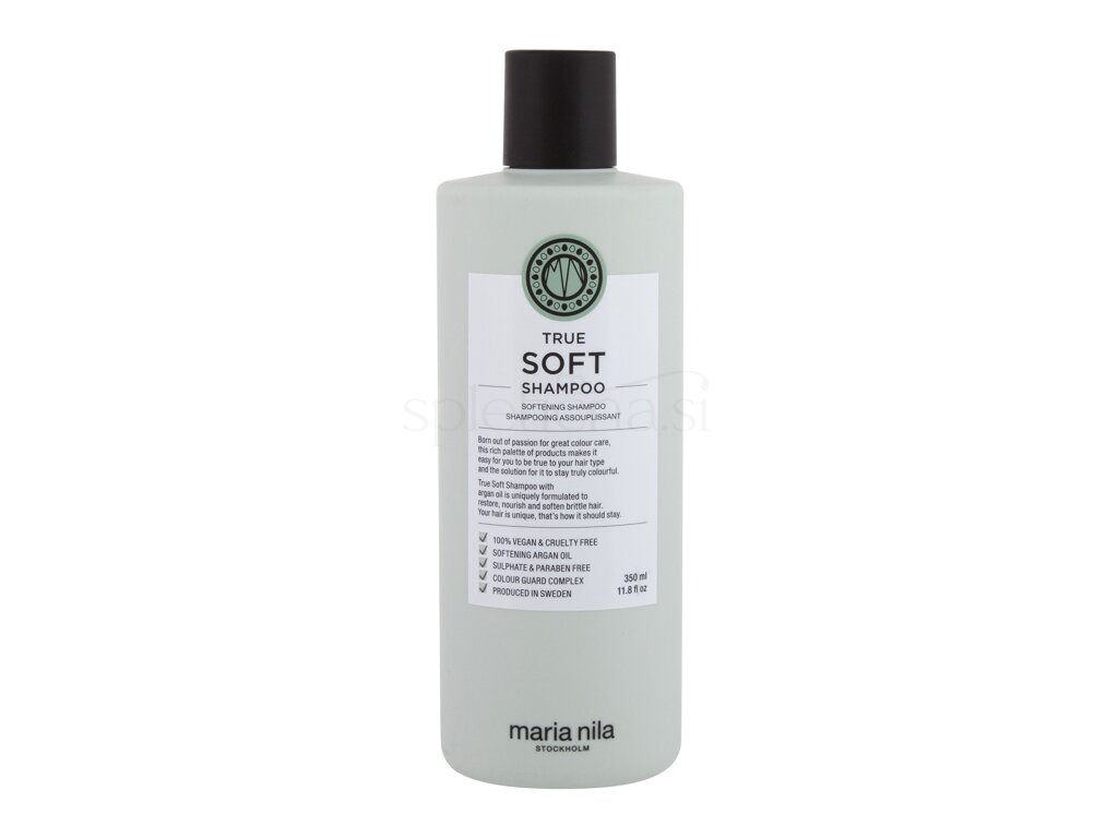 Maria Nila True Soft Shampoo je šampon za naravno suhe lase, ki mehča, vlaži in zmanjšuje vročino ter statično elektriko. Polno arganovega olja, ki mehča, antioksidantov in maščobnih kislin, ki ohranjajo vlago in krepijo lase. Ima nežen vonj vanilije, vrtnice in jasmina. Color Guard Complex ohranja barvo tako, da lase ščiti pred UV sevanjem in prostimi radikali.