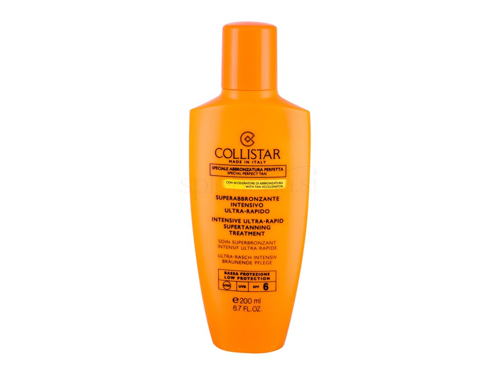 Collistar Special Perfect Tan Intensive Ultra-Rapid Supertanning aktivator za hitro porjavitev z zaščito pred soncem, ocenjeno s SPF6. Je revolucionarni izdelek, ki pospeši in poveča proizvodnjo melanina, s tem pa pospeši in zagotovi naravno porjavelost, tudi ko sonce ni zelo aktivno. Kompleks Unipertan® z oleoiltirozinom, beta-karotenom in korenčkovim ekstraktom omogoča hitro porjavitev, zaščita pred UVA/UVB žarki, ozonom, infrardečim sevanjem in prostimi radikali pa poskrbi, da bo vaše sončenje brez skrbi. Kožo vlaži in mehča, je vodoodporen, ima prijeten vonj in primeren za telo in obraz.